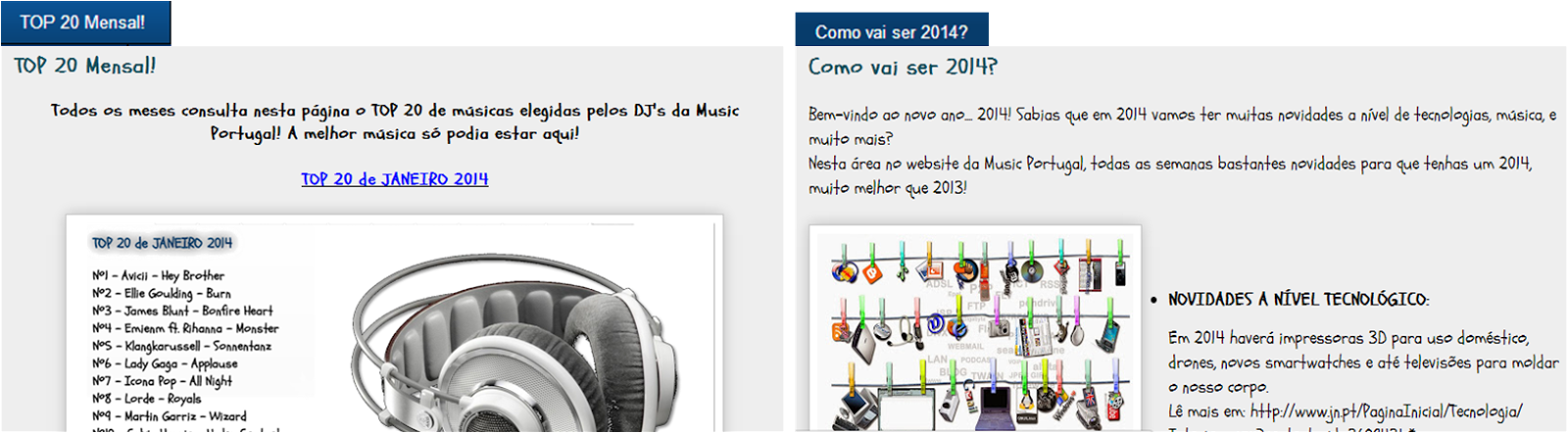 A Music Portugal cresceu! Agora pode ver que o nosso website tem um novo visual com novos conteúdos e com uma novidade.... agora as notícias e músicas TOP já não aparecem na página principal mas sim em duas páginas diferentes, logo ao lado direito da página "Bem-Vindo"!